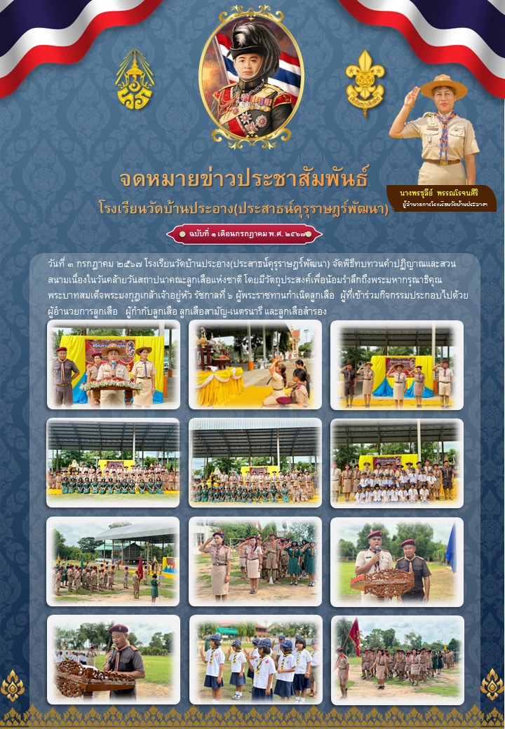 | วันที่ 3 กรกฎาคม 2567 โรงเรียนวัดบ้านประอาง(ประสาธน์คุรุราษฎร์พัฒนา) จัดพิธีทบทวน คำปฏิญาณและสวนสนามเนื่องในวันคล้ายวันสถาปนาคณะลูกเสือแห่งชาติ โดยมีวัตถุประสงค์เพื่อน้อมรำลึกถึงพระมหากรุณาธิคุณพระบามสมเด็จพระมงกุฎเกล้าเจ้าอยู่หัว รัชกาลที่ 6 ผู้พระราชทานกำเนิดลูกเสือ ผู้ที่เข้าร่วมกิจกรรมประกอบไปด้วย ผู้อำนวยการลูกเสือ ผู้กำกับลูกเสือ ลูกเสือสามัญ-เนตรนารี และลูกเสือสำรอง |